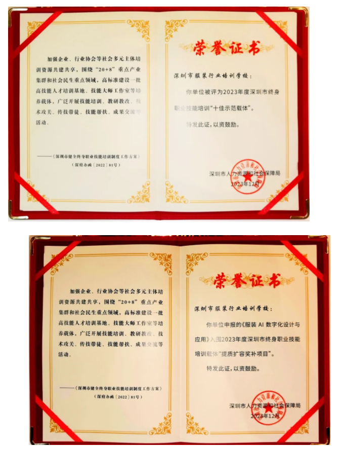 深圳市服装行业培训学校被评为2023年度深圳市终身职业技能培训“十佳示范载体”,申报的《服装AI数字化设计与应用》入围2023年度深圳市终身职业技能培训载体“提质扩容奖补项目”。